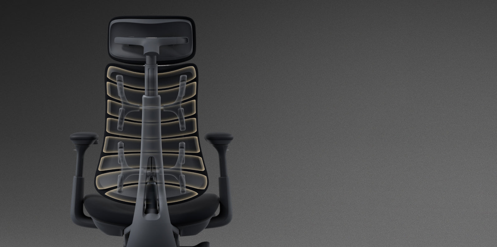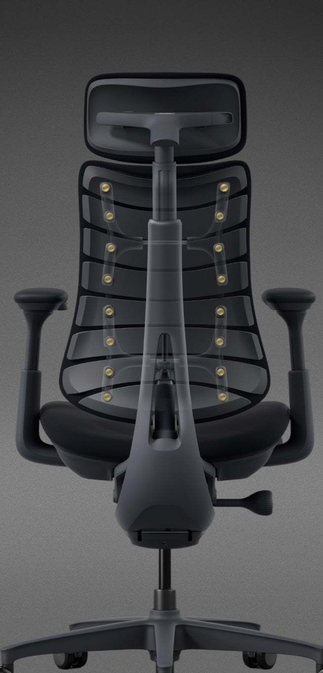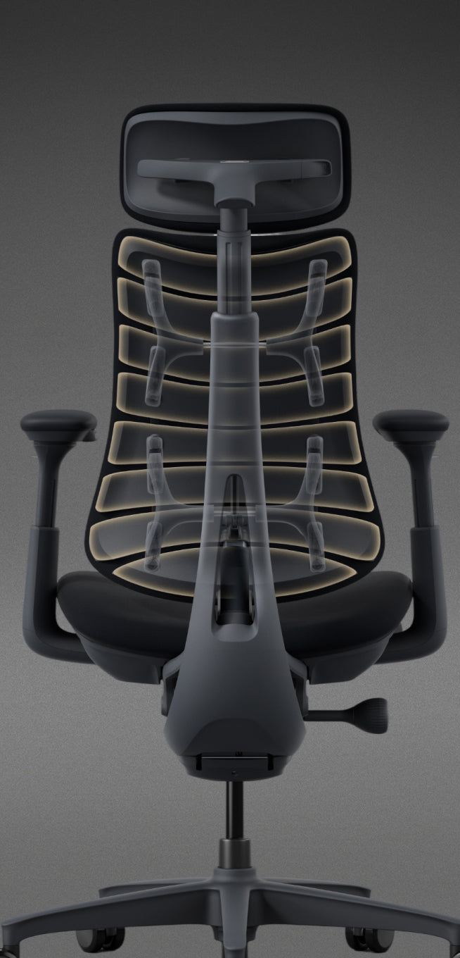 Lo schienale è dotato di 8 pannelli flessibili collegati da 14 punti di connessione doppia, che formano una superficie di supporto dinamica. Dotato di staffe sferiche a doppio strato e 16 punti di snodo, garantisce flessibilità e stabilità, per un allineamento spinale personalizzato con un supporto elastico.