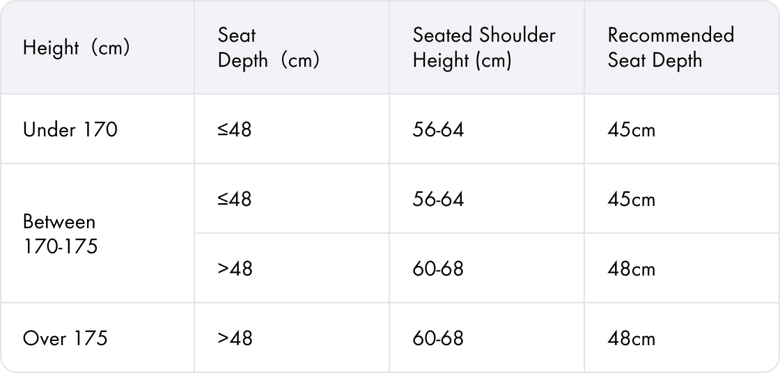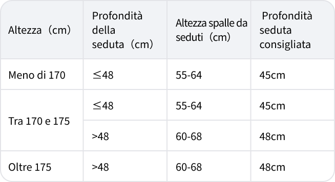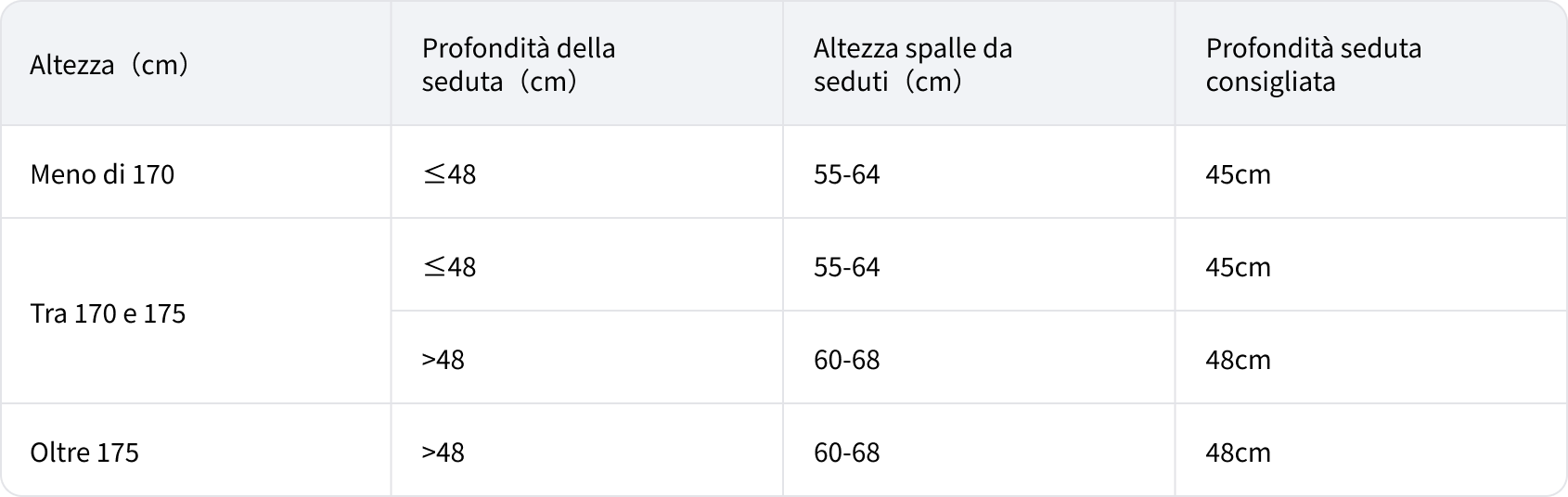 Misura la profondità della seduta. Scelga la versione da 45 cm o 48 cm per un perfetto supporto per le cosce e comfort.